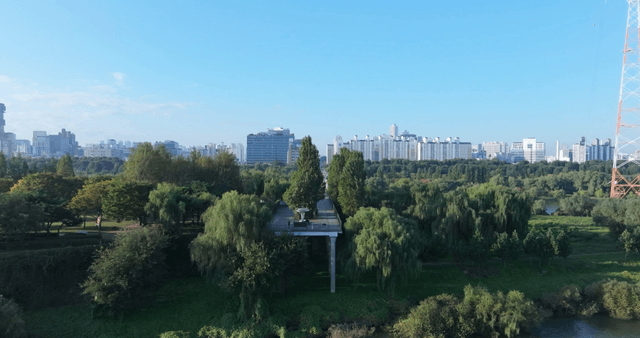 서울 도시 스카이라인 아래 푸른 공원