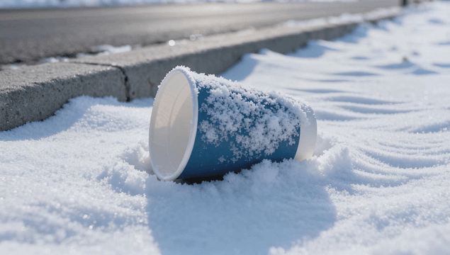 컵이 있는 눈 덮인 도로변