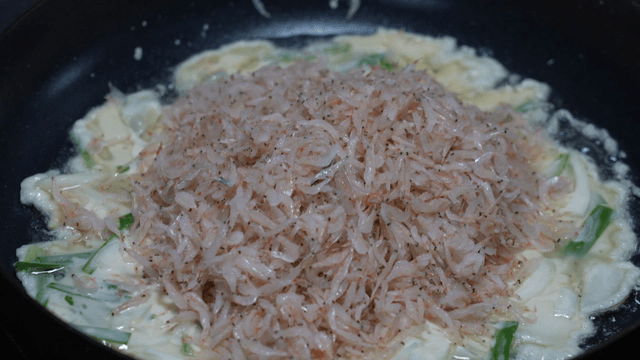 팬에서 요리 중인 바삭한 새우전
