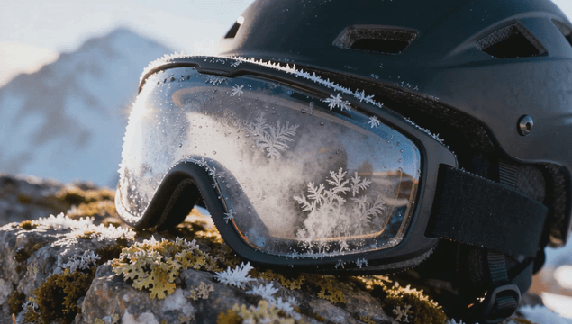 산 정상에 놓인 눈 덮인 헬멧