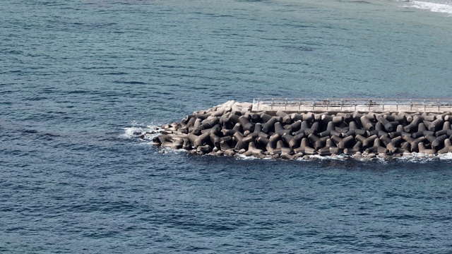 테트라포드 방파제가 있는 해안 도로의 항공 전망