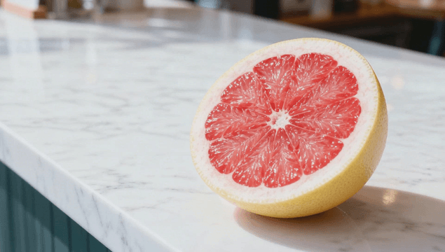 대리석 조리대 위의 반쪽 자몽