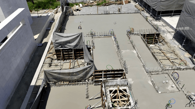 현장에서 젖은 콘크리트를 고르게 하는 작업자