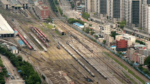 달리는 열차에서 바라본 철도와 플랫폼 풍경
