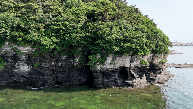 바다 옆 무성한 녹음이 있는 바위 절벽