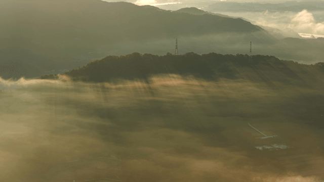 안개 낀 산 위로 햇살이 비치는 모습