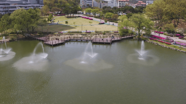 고요한 호수와 경치 좋은 공원의 항공 뷰