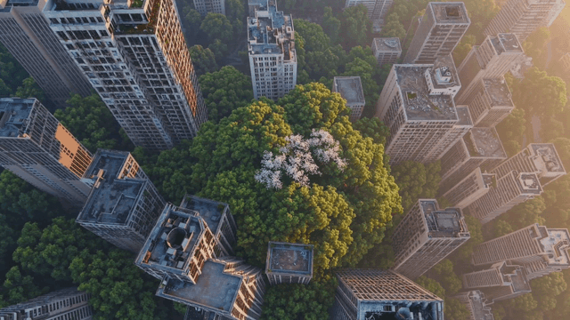 푸른 녹지로 둘러싸인 고층 건물