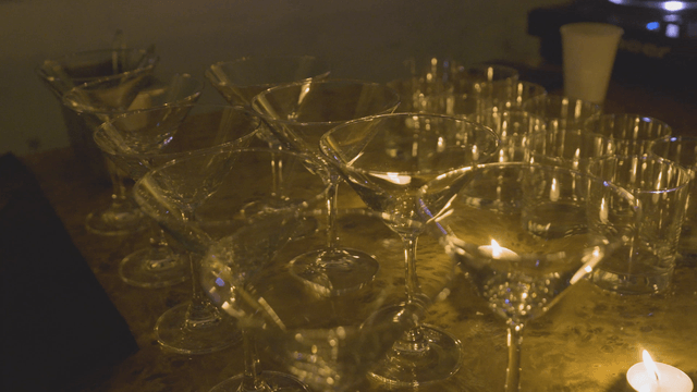 어둡게 조명된 공간의 와인잔들