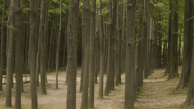 키 큰 나무와 벤치가 있는 고요한 숲