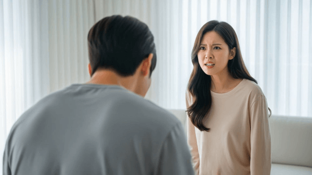거실에서 심각한 표정으로 싸우는 커플