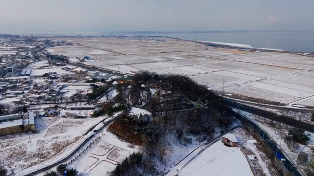 눈 덮인 강변과 도시 풍경
