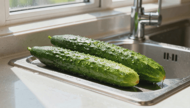 싱크대에 물방울이 맺힌 신선한 오이