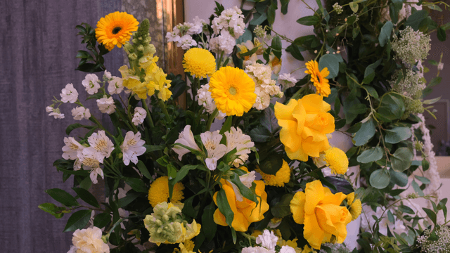 실내에서 두 개의 꽃다발을 들고 있는 사람