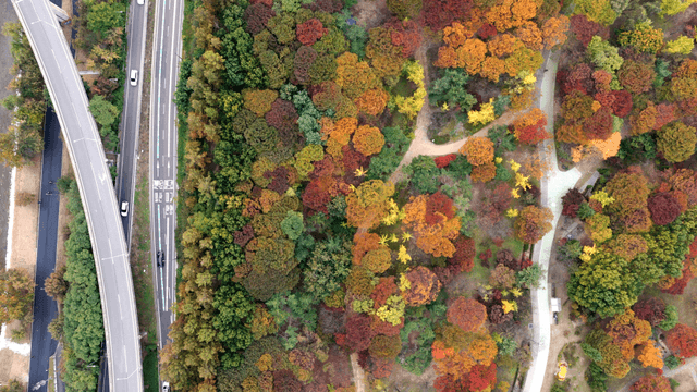 알록달록한 가을 숲을 지나는 구불구불한 도로
