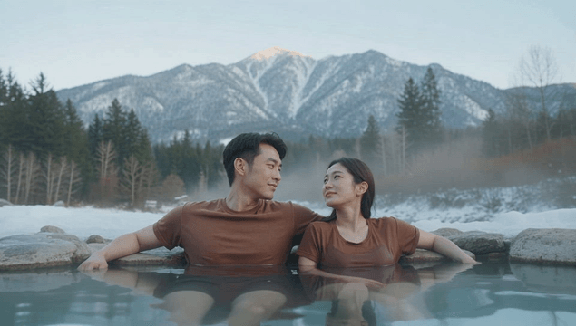 눈 덮인 산을 배경으로 온천에서 휴식을 취하는 커플