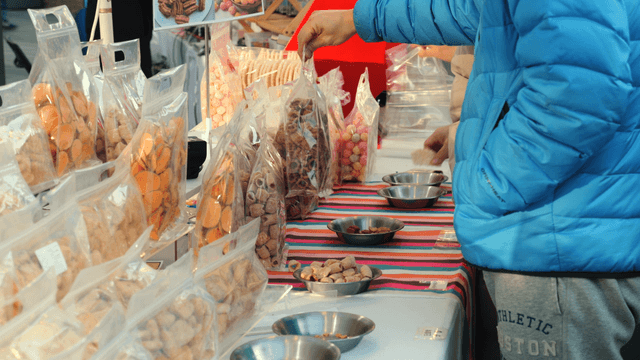 한국의 전통 과자들을 용기에 담는 시장 상인