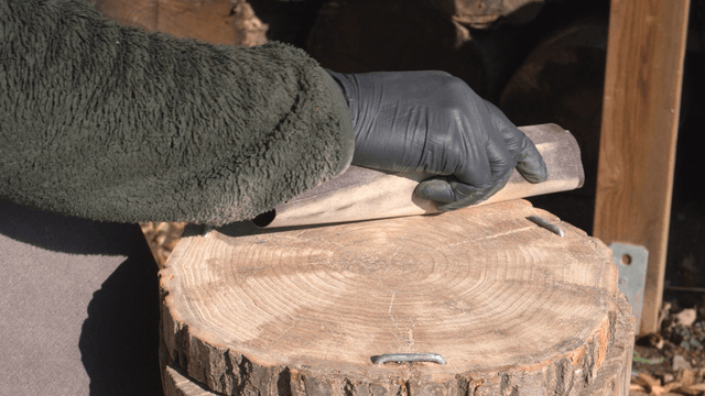 나무 통나무의 구멍을 다듬는 장갑 낀 손