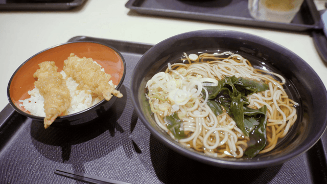 새우 튀김과 따뜻한 일본 우동