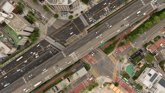 붐비는 도시 교차로의 상공에서 본 전경