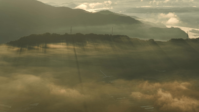 안개 낀 산 위로 햇살이 비치는 모습