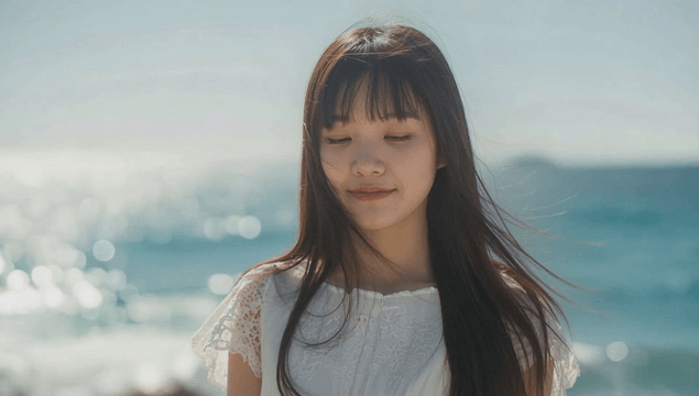 바다 앞에서 정면을 보고 미소 짓는 여성