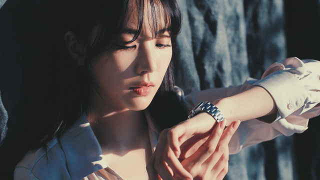 어두운 곳에서 손목시계를 만지는 젊은 여성