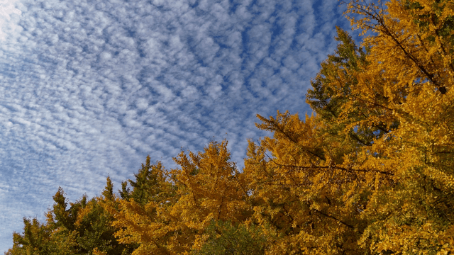 흩어진 구름과 가을 은행나무가 있는 푸른 하늘