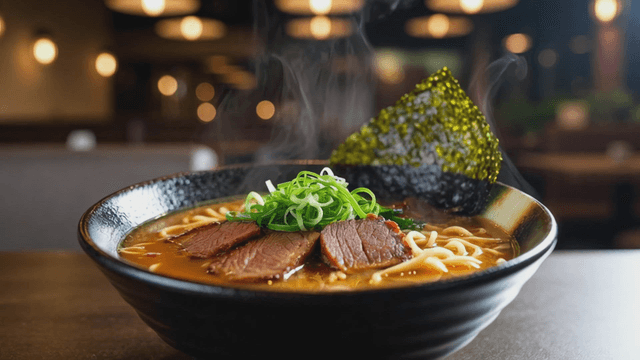 김이 모락모락 나는 토핑이 올라간 라멘 한 그릇