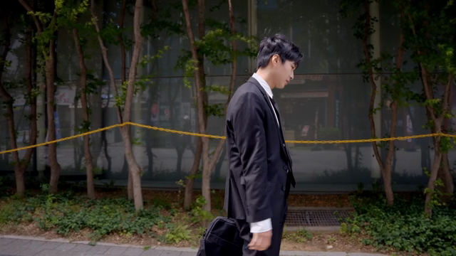 건물 앞에서 복잡한 표정의 직장인 남성