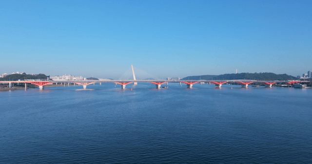 현대 도시를 잇는 다리 아래로 흐르는 넓은 강