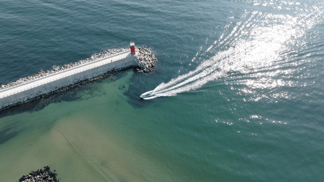 해안 방파제를 근처를 지나는 보트