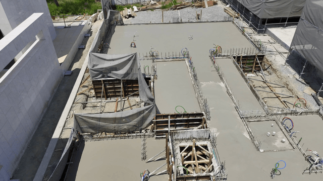 현장에서 젖은 콘크리트를 고르게 하는 작업자
