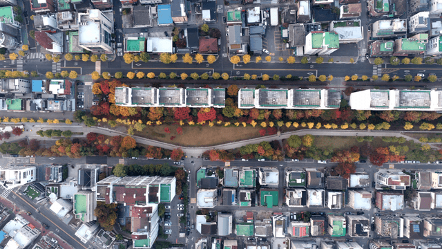 가을 나무가 있는 도시의 항공 뷰