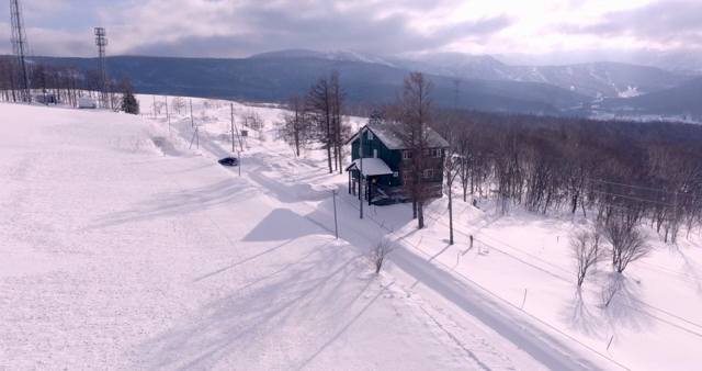 눈 덮인 산과 오두막 풍경