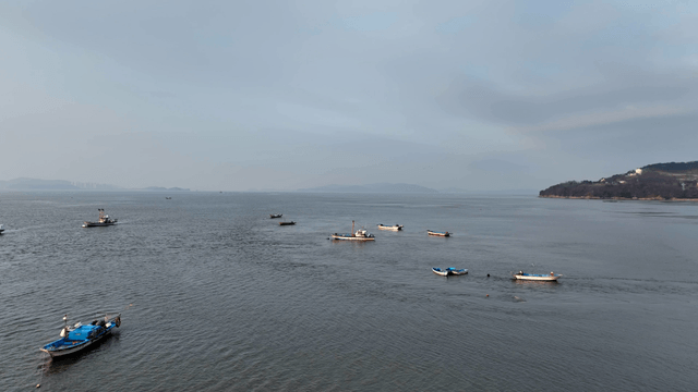 맑은 하늘 아래 잔잔한 바다를 가로지르는 어선