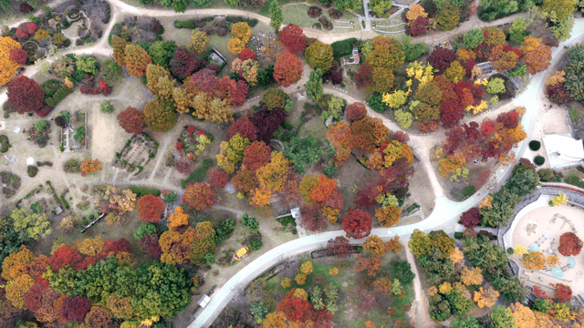 알록달록한 가을 숲을 지나는 구불구불한 도로