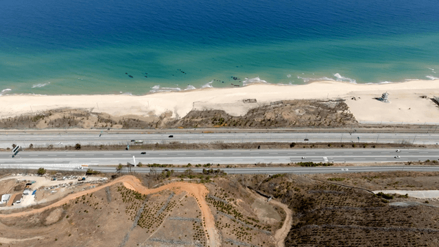 해안 마을과 모래사장 사이 도로를 달리는 차