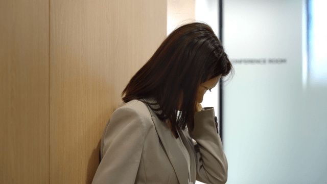 엘리베이터를 기다리며 생각에 잠긴 여성