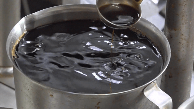 야외에서 나무 국자로 걸쭉한 검은 간장을 붓는 장면