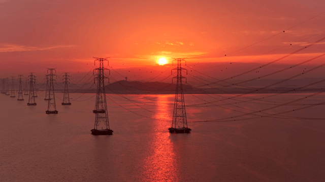 강 위 일몰을 배경으로 이어진 송전탑 전선