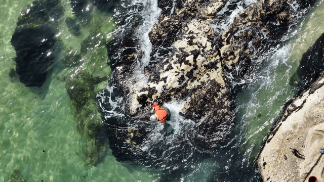 파도가 바위 해안에 부드럽게 부서지는 모습
