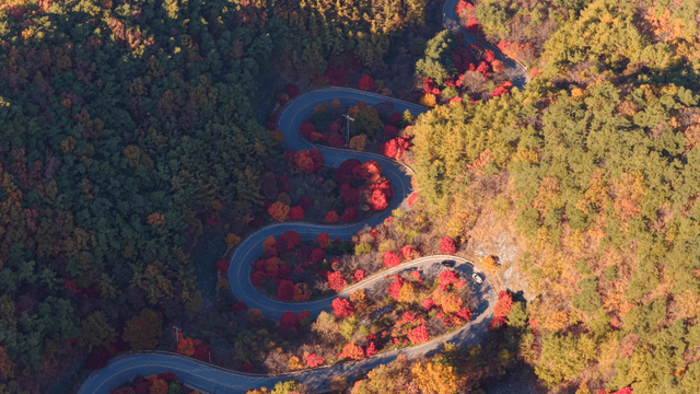 알록달록한 가을 숲을 지나는 구불구불한 도로