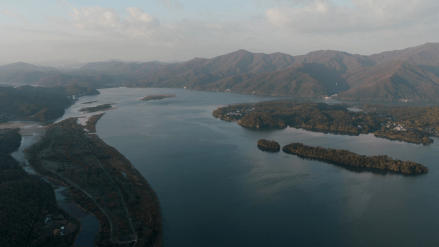 강과 울창한 푸른 산으로 둘러싸인 마을