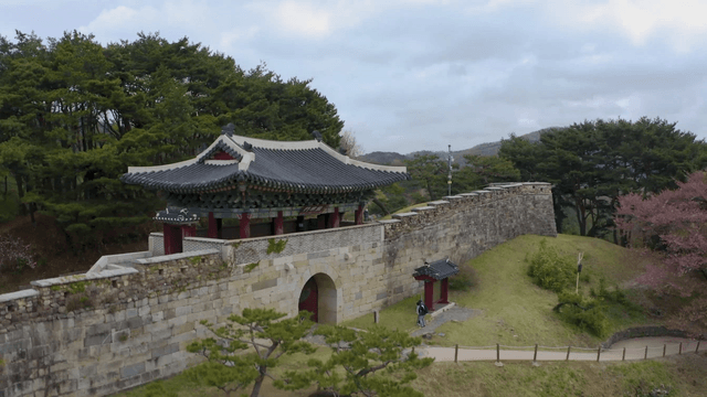 성문을 따라 벚꽃이 어우러진 성곽 풍경