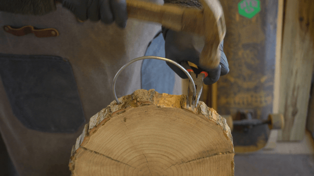 망치로 금속 와이어를 나무 판에 꽂는 장인