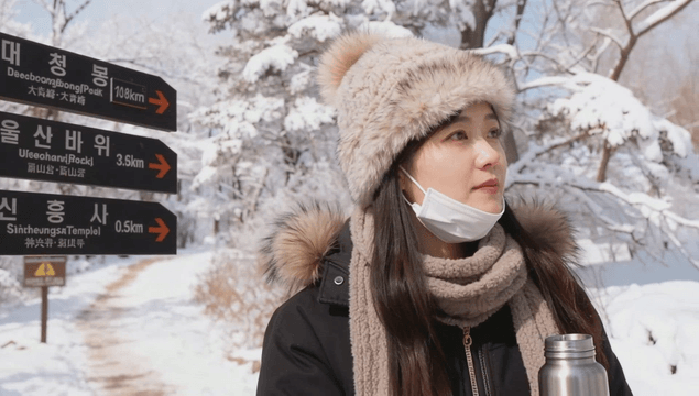 눈 덮인 숲 이정표 옆에서 보온병으로 따듯한 음료를 마시는 여성