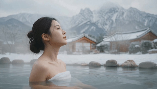 눈 덮인 풍경 속 온천을 즐기는 여성들