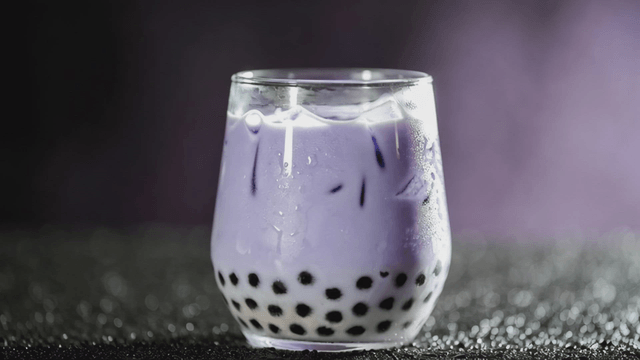 빨대가 꽂힌 보라색 타로 아이스 음료