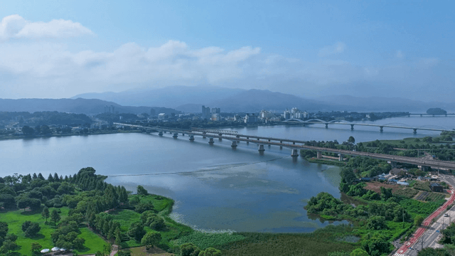 맑은 날에 강 위의 대형 동상과 현수교가 보이는 경치